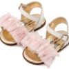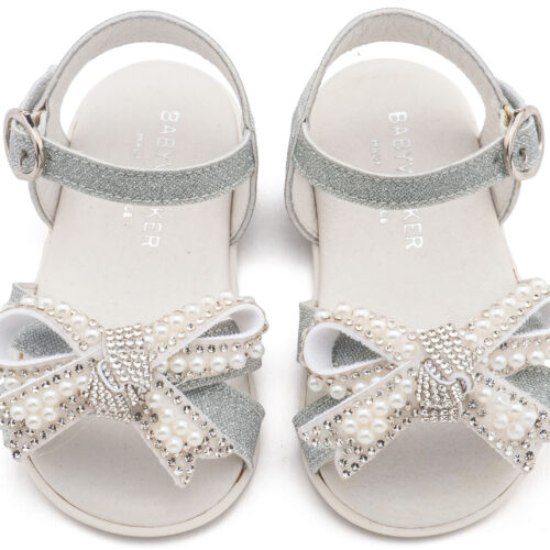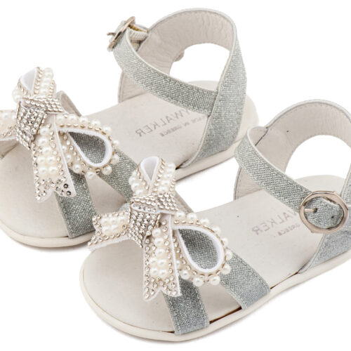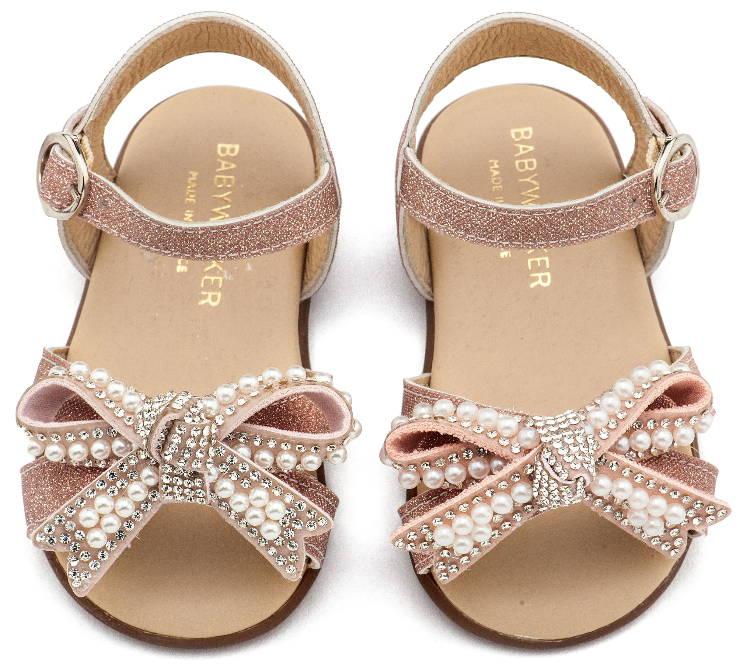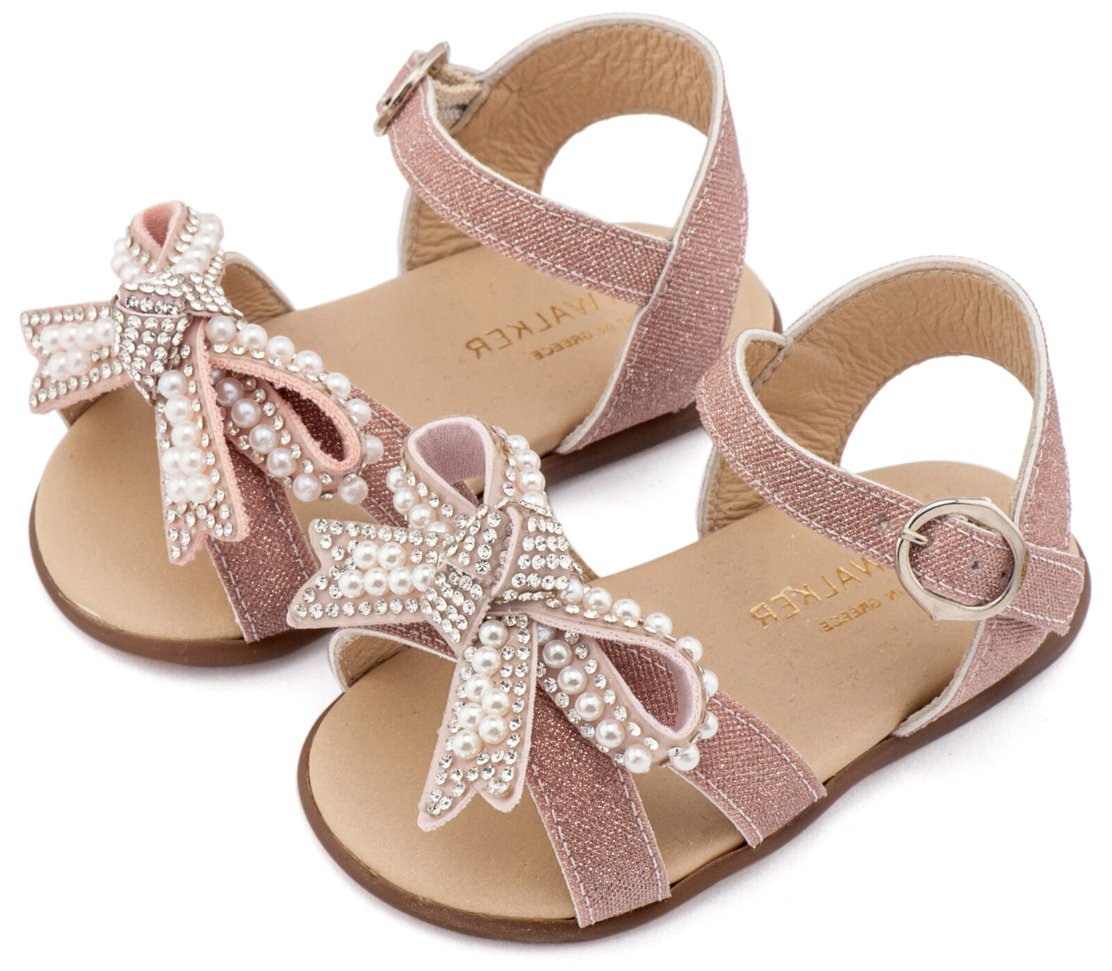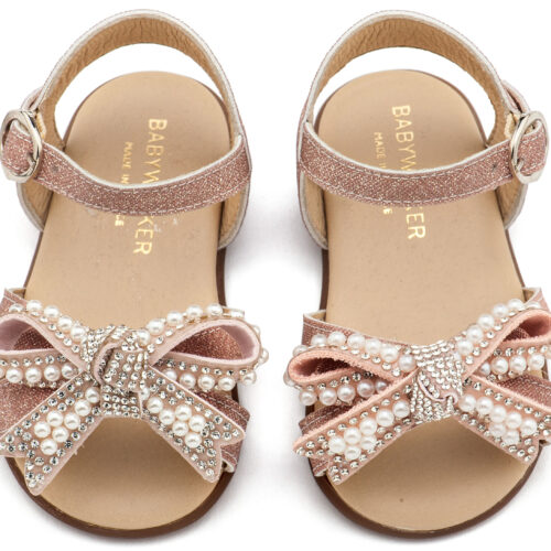 Βαπτιστικά Παπούτσια Babywalker Πέδιλο απο Μεταλλιζέ Ύφασμα Διακοσμημένο με Φιόγκο από Πέρλες PRI2655 σε Ροζ Αντικέ και Ασημί Χρώμα.