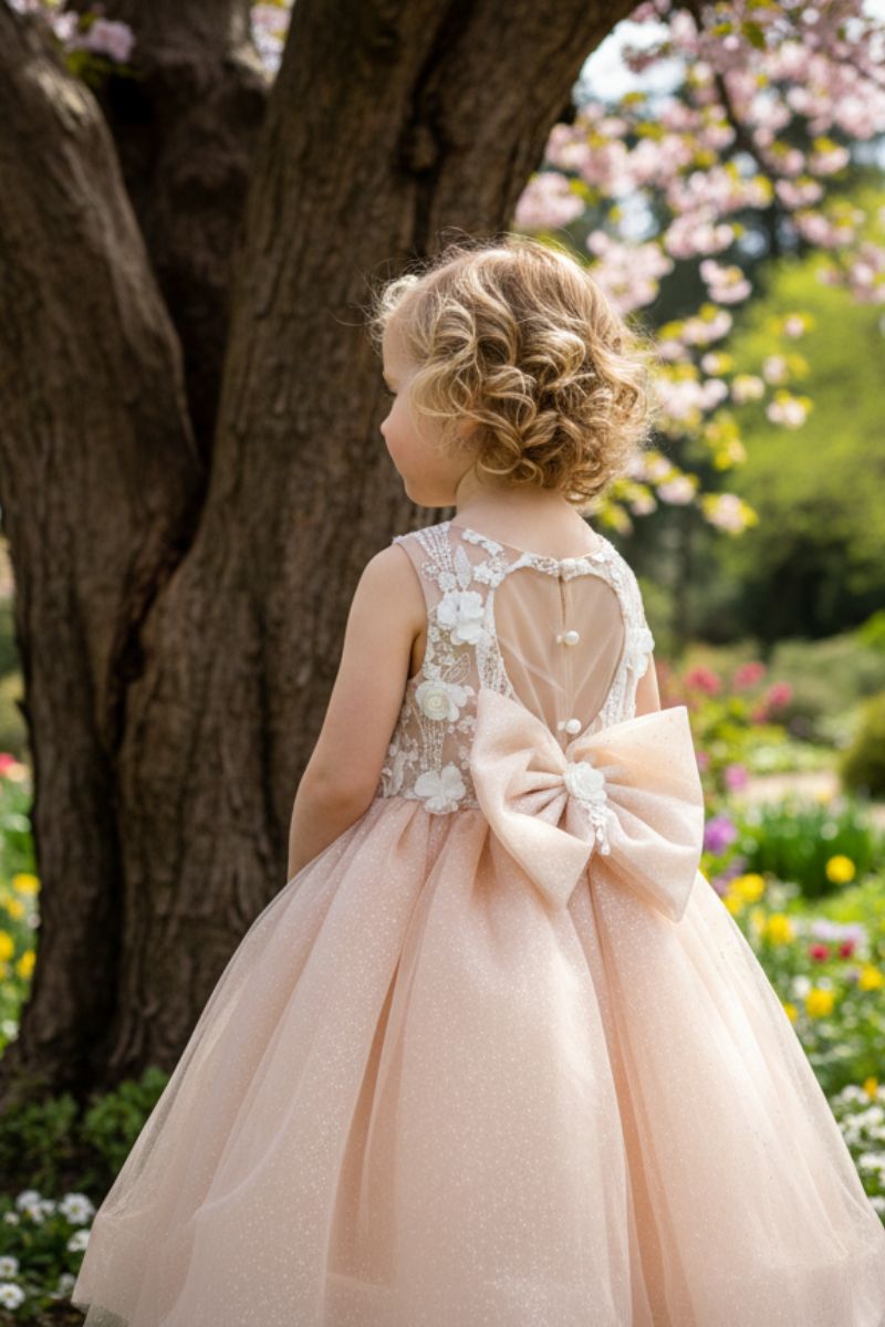 Εντυπωσιακό φόρεμα από αέρινο τούλι και δαντέλα που δημιουργεί μοναδική αίσθηση. Το επάνω μέρος είναι χειροποίητο με υπέροχη ανοιχτή πλάτη και φιόγκο. Εσωτερικά από 100% βαμβάκι. Χρώμα σομόν ροζ