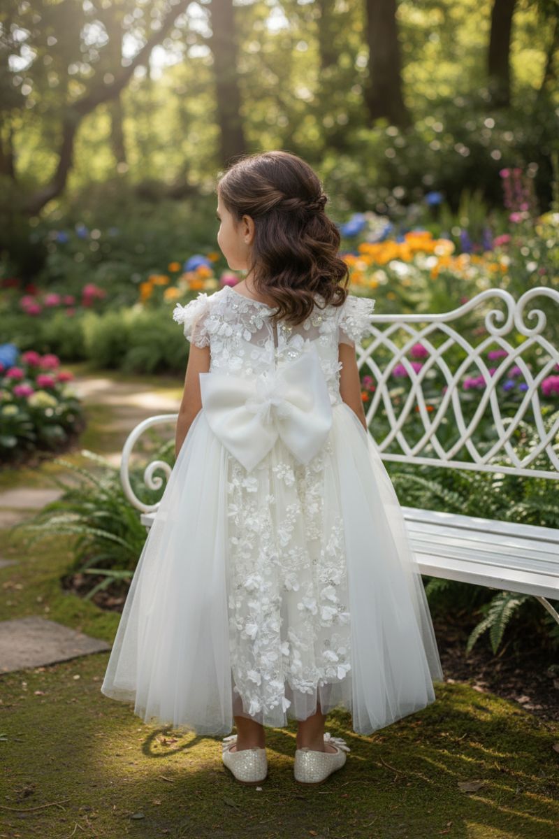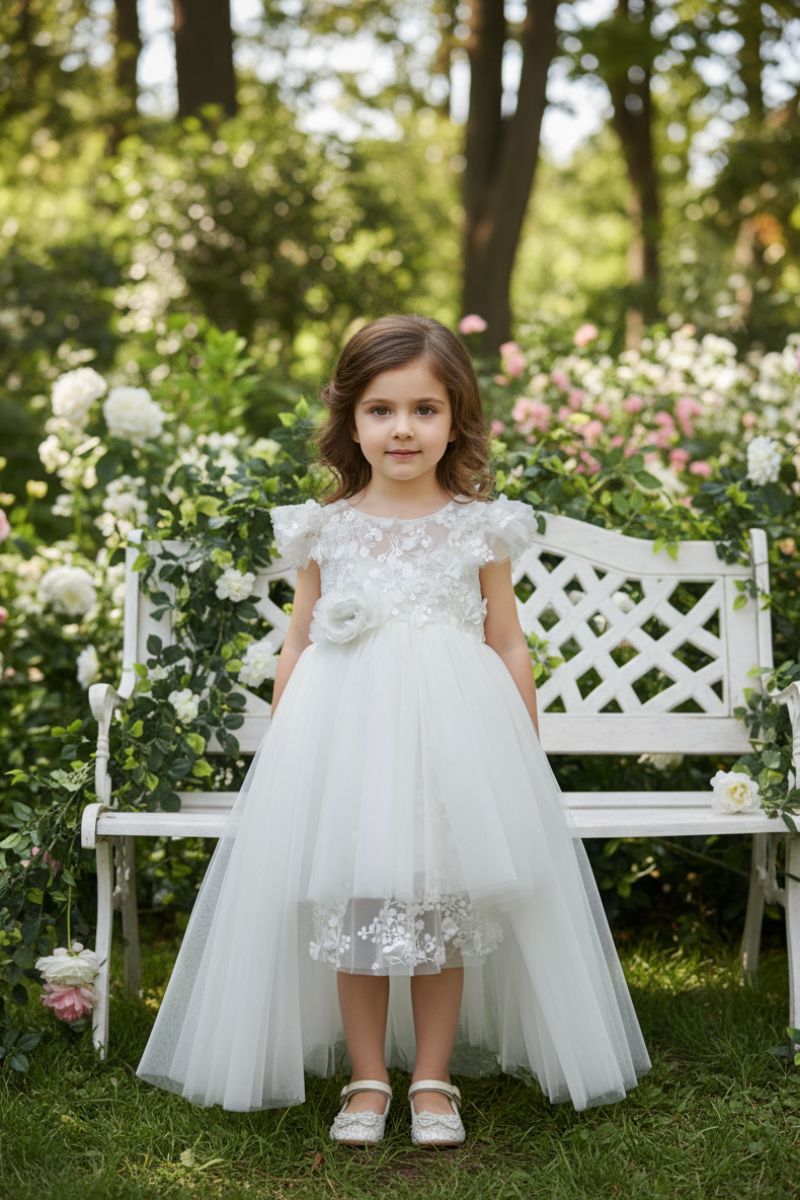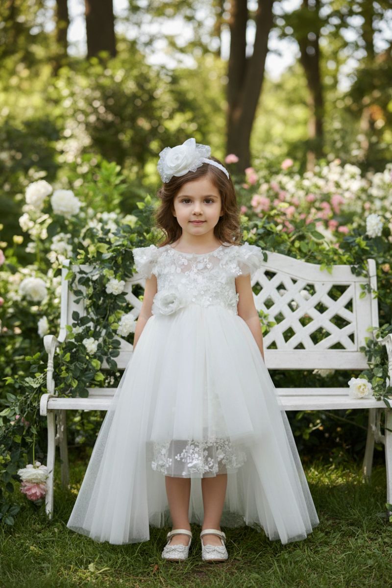 Πριγκιπικό Ρομαντικό βαπτιστικό φόρεμα με χειροποίητο λουλουδάκι και υπέροχη ουρά στο πίσω μέρος με ιδιαίτερη δαντέλα και φιόγκο. Το φόρεμα είναι κατασκευασμένο από μοναδικής ποιότητας υφάσματα και δαντέλα που δημιουργεί μοναδική αίσθηση σε ιβουάρ απόχρωση. Πρόκειται για ένα φόρεμα υψηλής ραπτικής. Το εσωτερικό του είναι επενδυμένο με φόδρα 100% βαμβακερή. Χρώματα: ιβουάρ