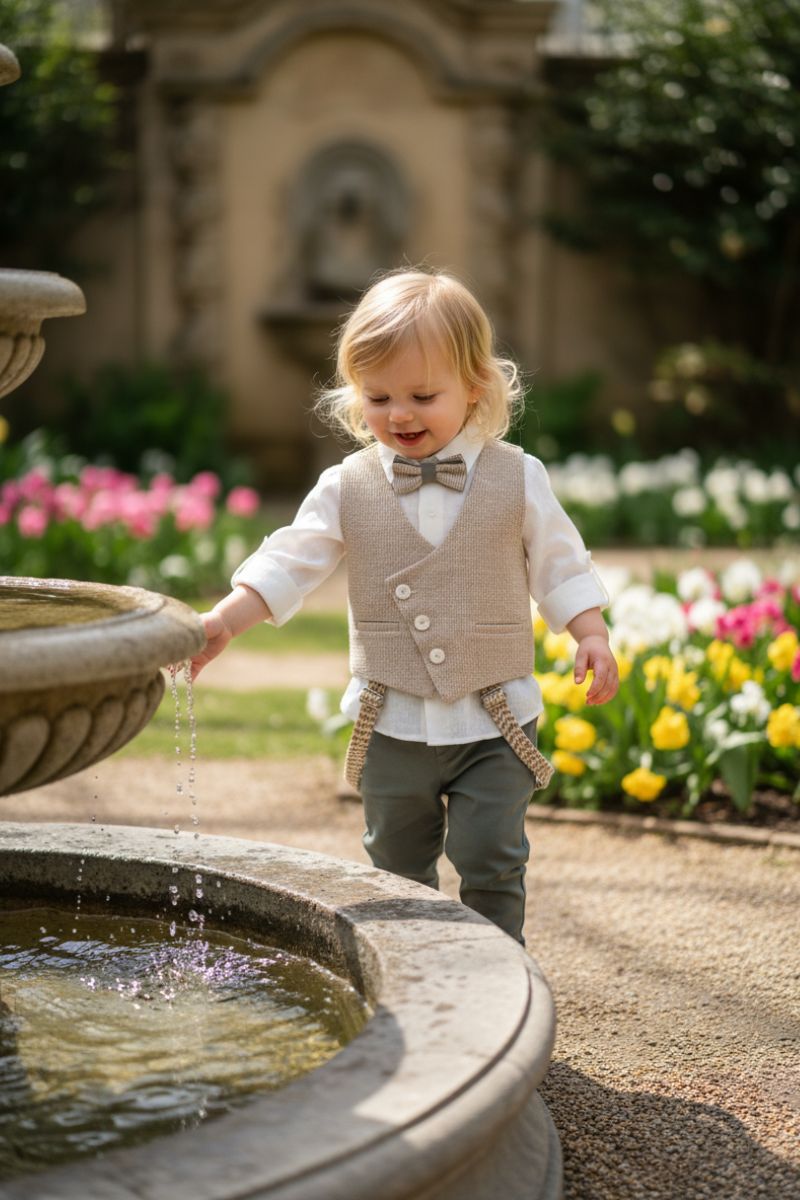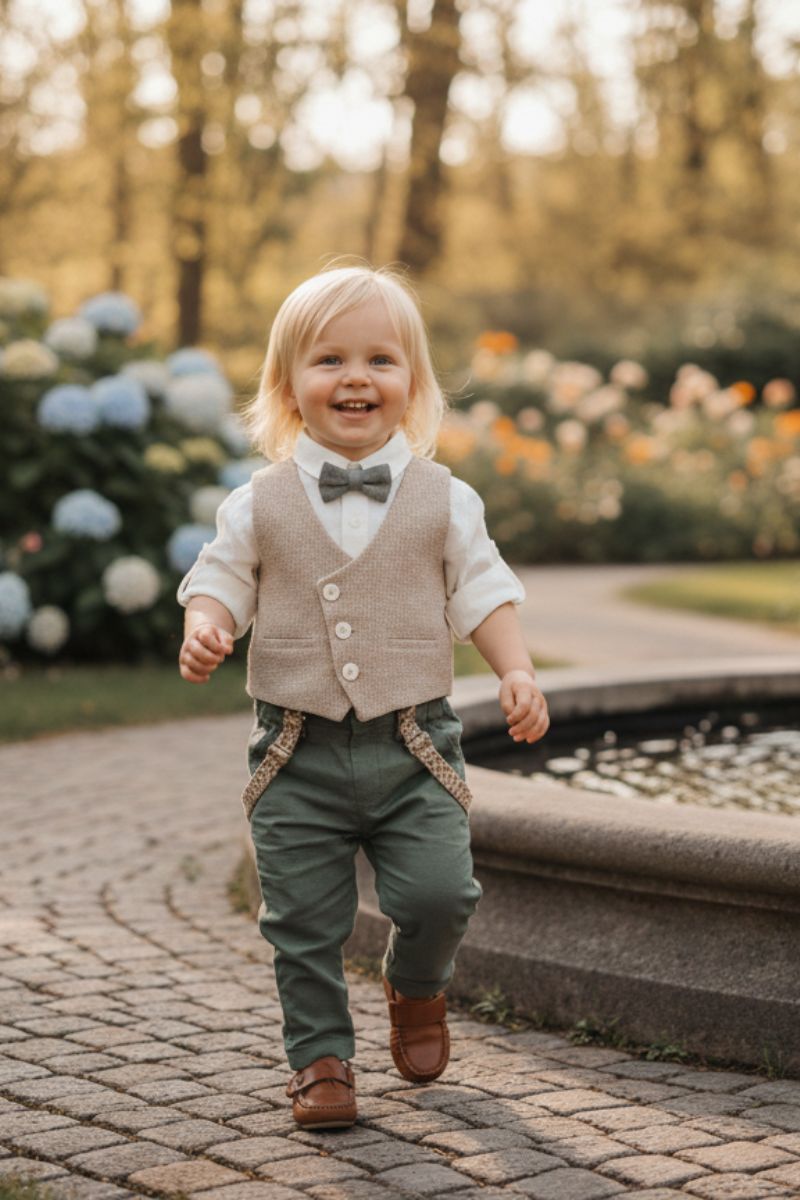 Το εξαιρετικής ποιότητας σετ της Dolce Bambini αποτελείται από πράσινο κυπαρισσί βαμβακερό παντελόνι, πουκάμισο λευκό και γιλέκο σε εκρού αποχρώσεις, προσφέροντας άνεση και κομψότητα.