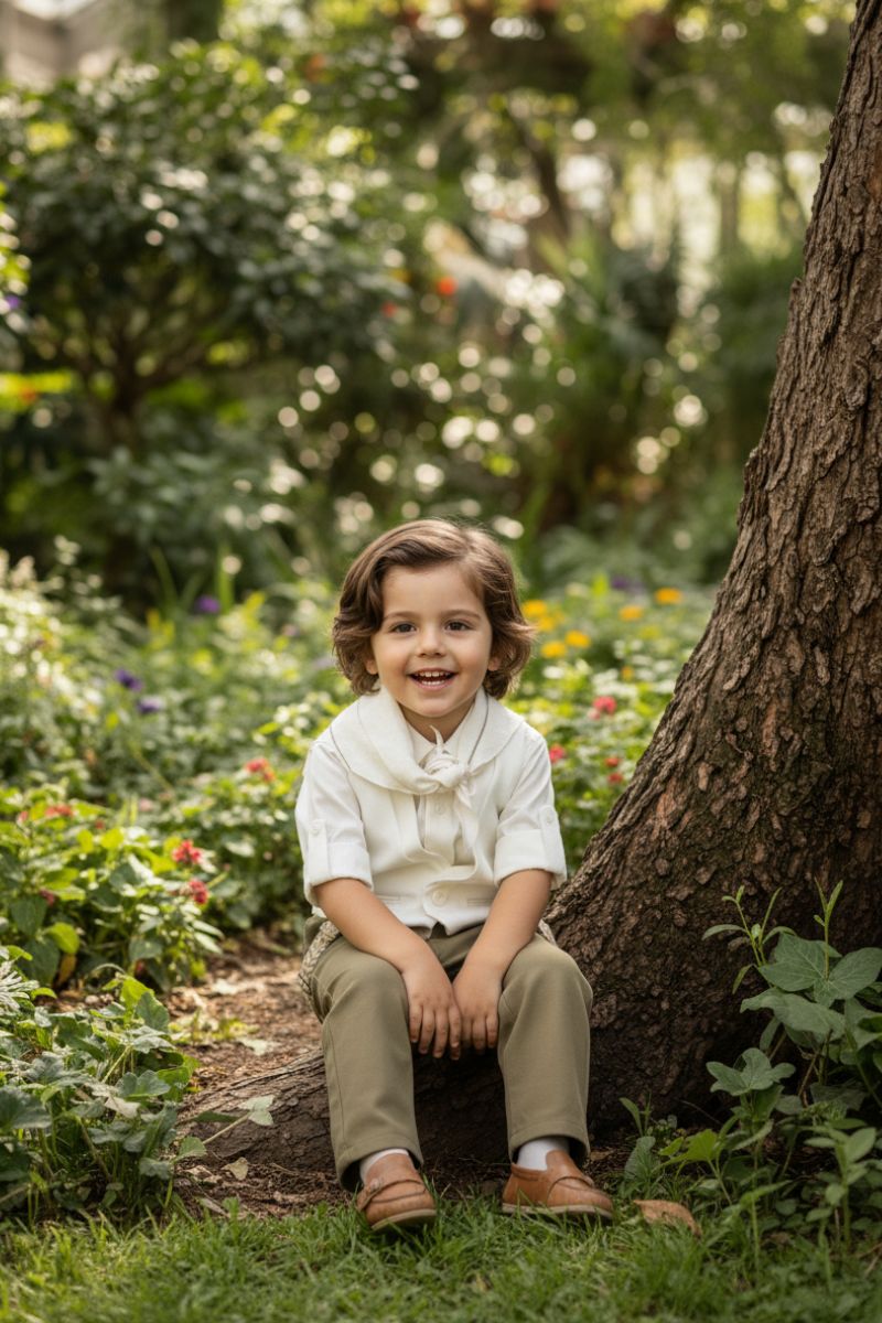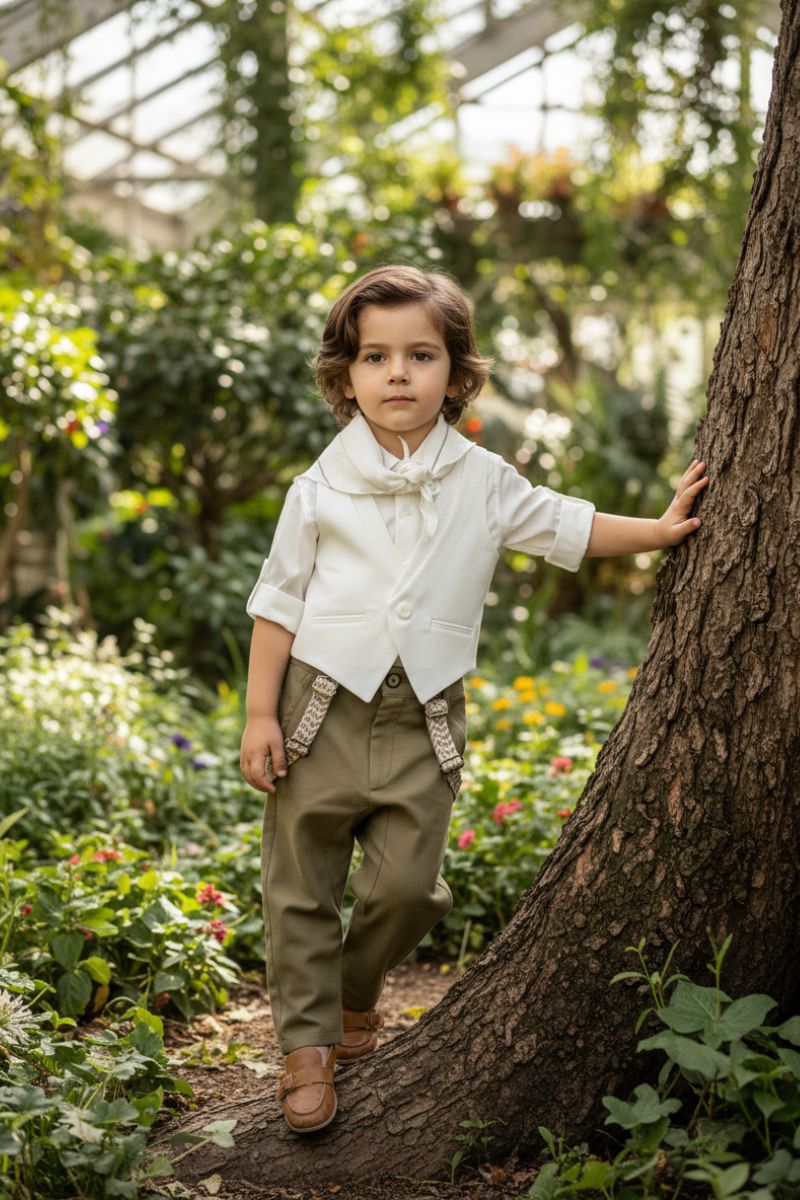 Το εξαιρετικής ποιότητας σετ της Dolce Bambini αποτελείται από πράσινο ελιάς βαμβακερό παντελόνι, πουκάμισο εκρού και γιλέκο σε εκρού απόχρωση, προσφέροντας άνεση και κομψότητα.