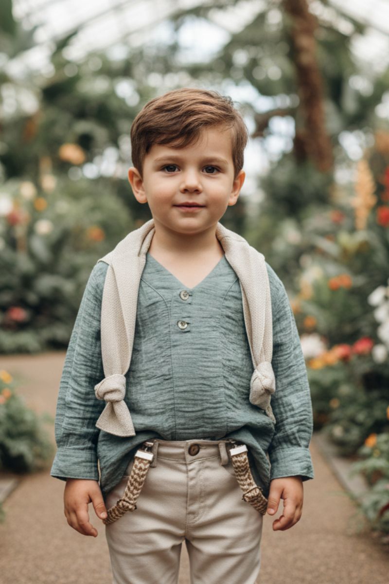 Το σετ Dolce Bambini αποτελείται από λινή πουκαμίσα σε μέντα απόχρωση και παντελόνι μπεζ βαμβακερό, προσφέροντας άνεση και κομψότητα.