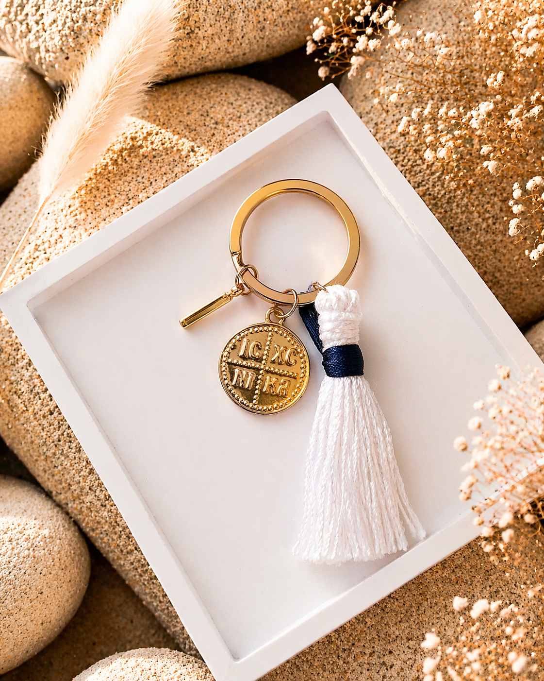 Μαρτυρικά βάπτισης για αγόρι μπρελόκ με χρυσό Κωνσταντινάτο σταυρό, μονόγραμμα και φούντα. Ελάχιστη παραγγελία 30 τεμάχια. Περιλαμβάνεται η συσκευασία.