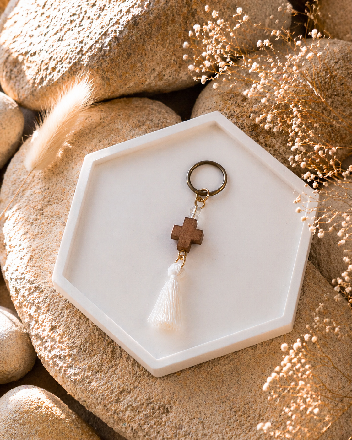 Ανακαλύψτε μοναδικά μαρτυρικά βάπτισης για κορίτσι και αγόρι, σχεδιασμένα με κομψότητα και ρομαντική αισθητική. Στη συλλογή μας θα βρείτε μαρτυρικά μπρελόκ με ξύλινο σταυρό και φούντα εκρού.