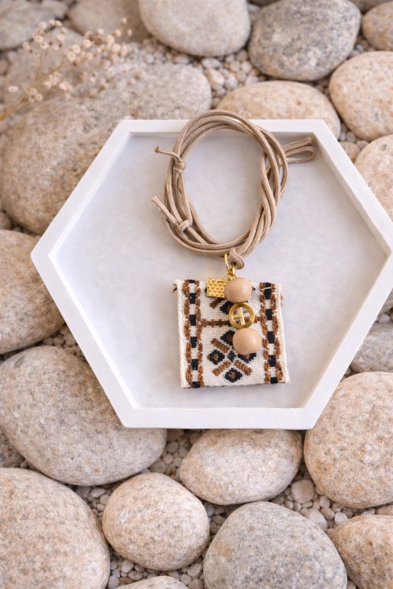 Μαρτυρικό βάπτισης κολιέ με χρυσό σταυρό, υφαντή τρέσα και ξύλινη χάντρα