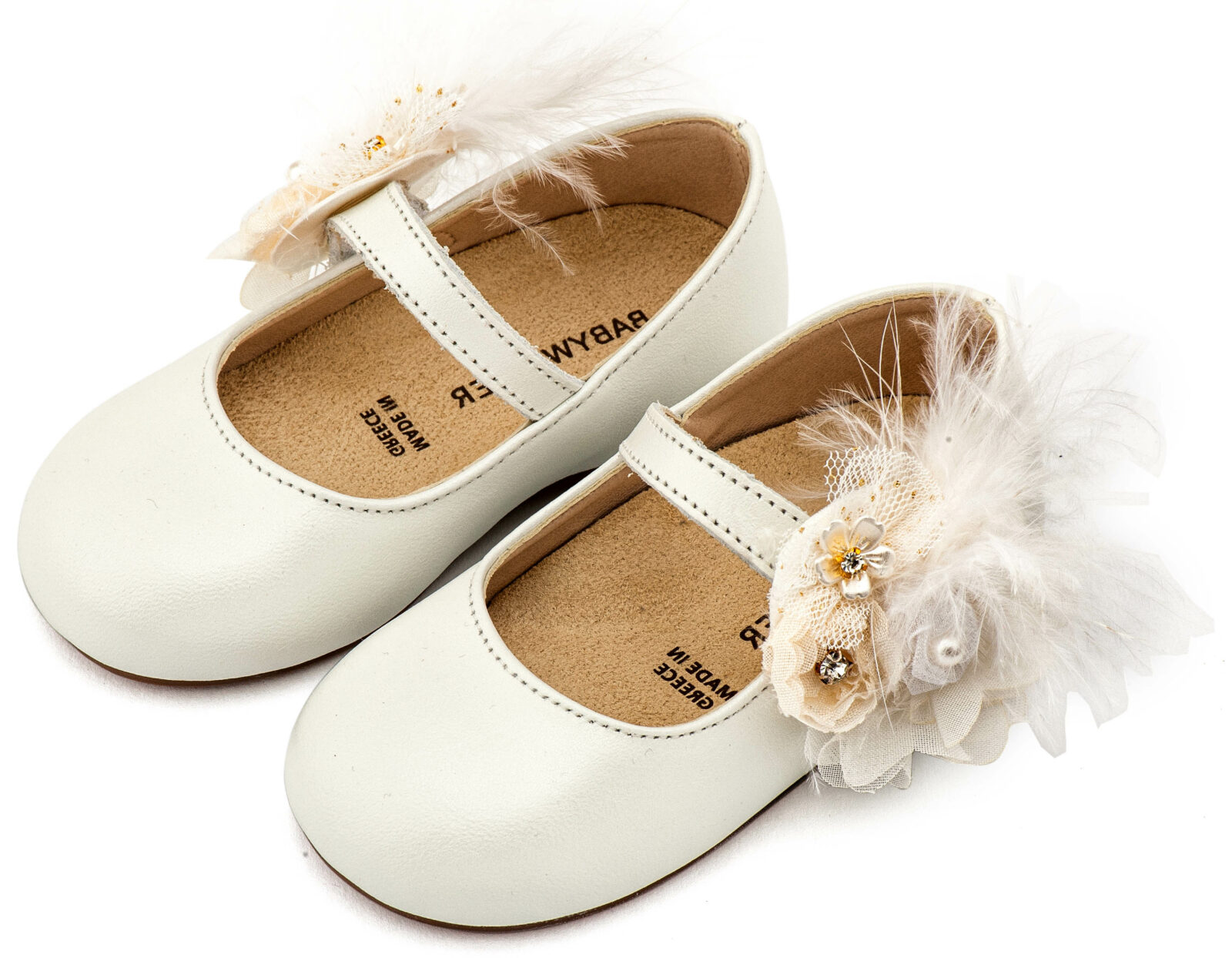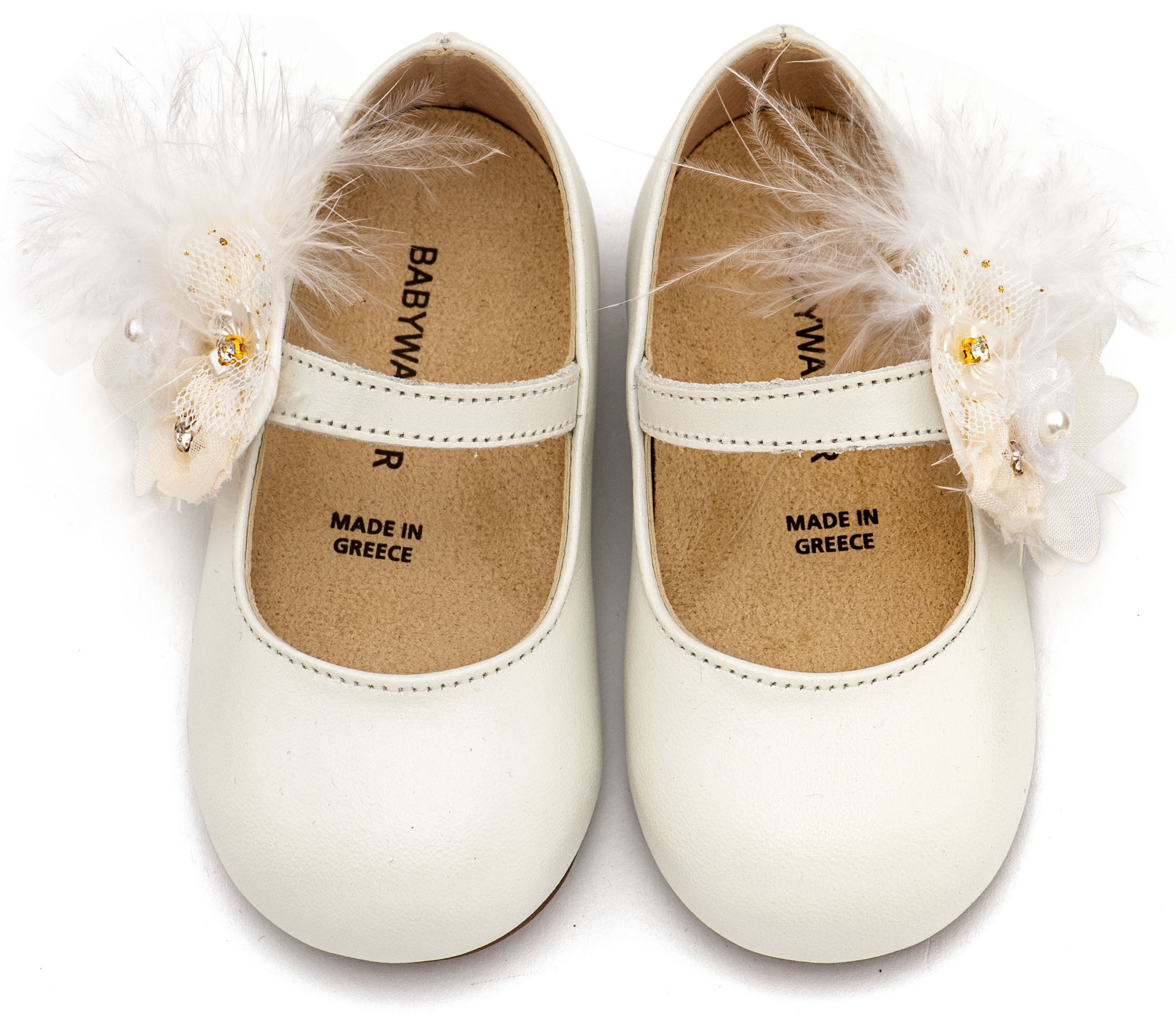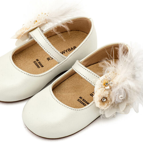 Βαπτιστικά Παπούτσια Babywalker Γοβάκι Μονή Μπαρέτα Διακοσμημένο με Λουλούδι και Πούπουλα MI1664 Εκρού και Λευκό