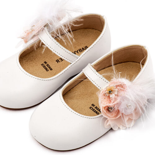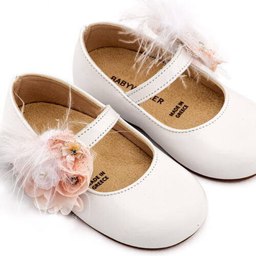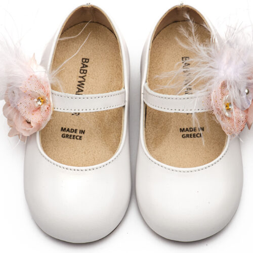 Βαπτιστικά Παπούτσια Babywalker Δερμάτινο Γοβάκι Μονή Μπαρέτα με Χειροποίητο Διακοσμητικό από Λουλούδια και Πούπουλα BW4887 σε Εκρού και Λευκό Ροζ Χρώμα.