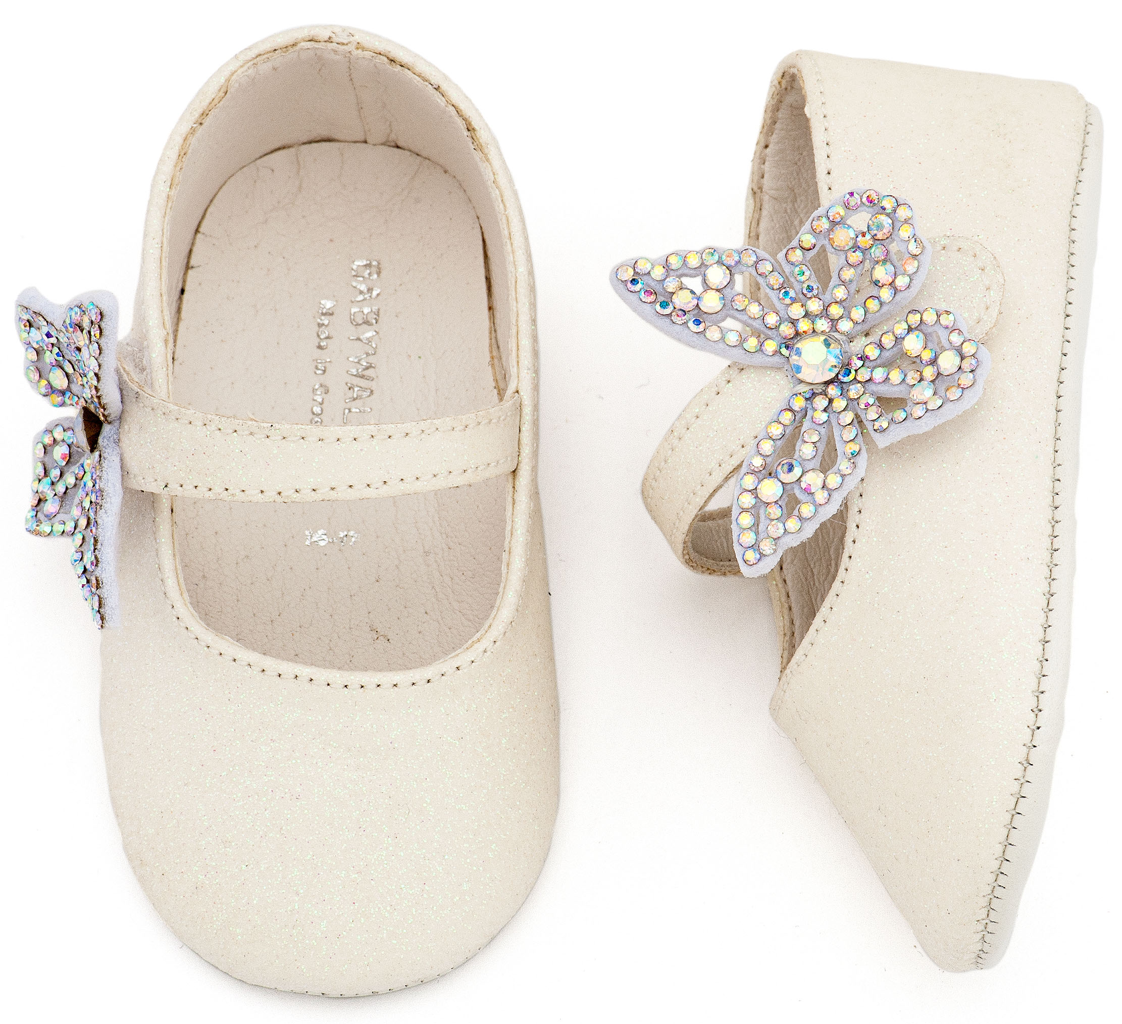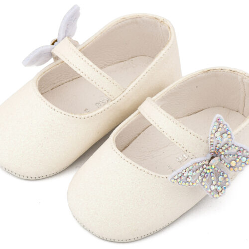 Βαπτιστικά Παπούτσια Babywalker Γοβάκι Μονή Μπαρέτα Χρατς με Στρασένια Πεταλούδα MI1658 Λευκό και Ροζ Χρώμα.