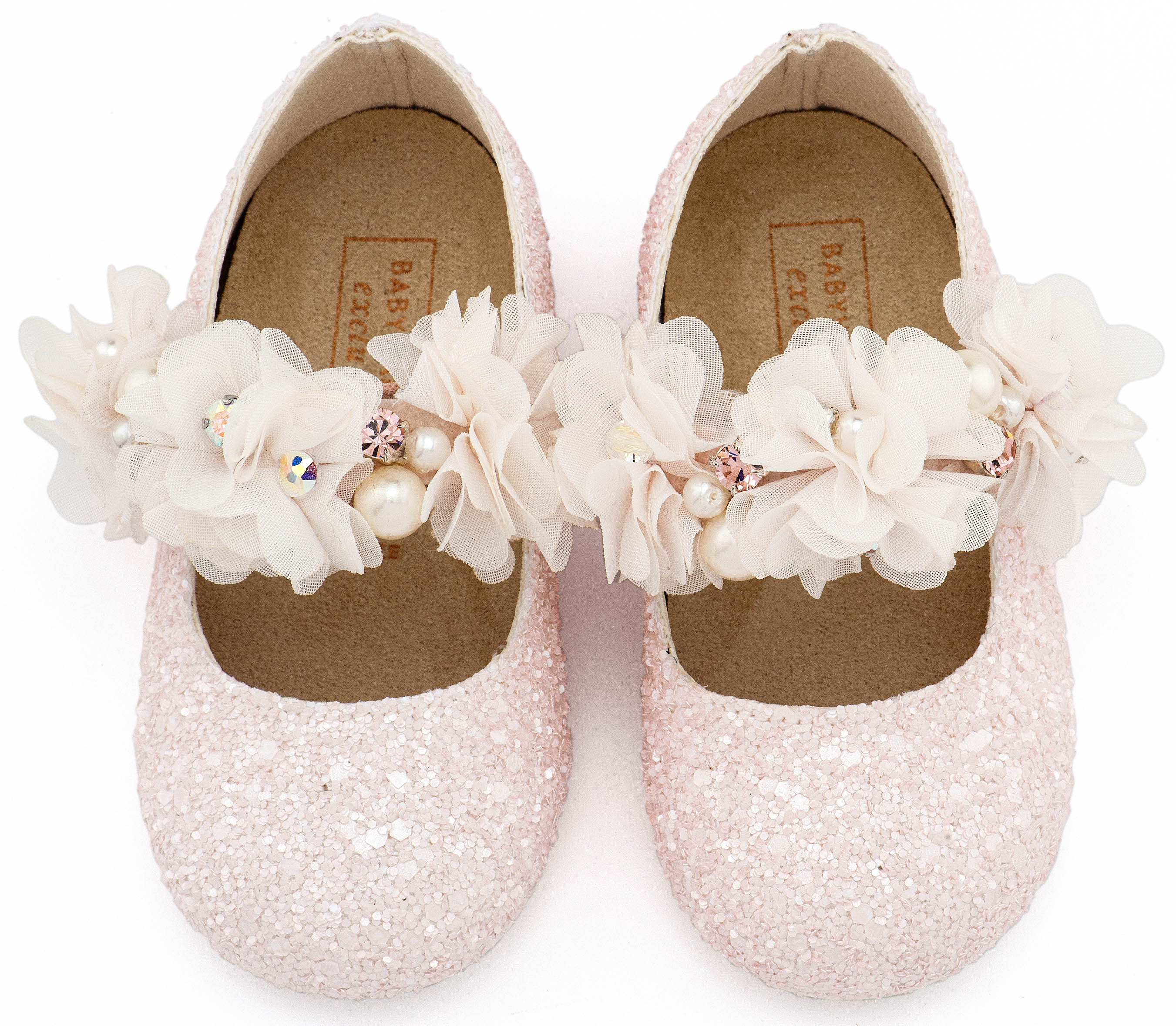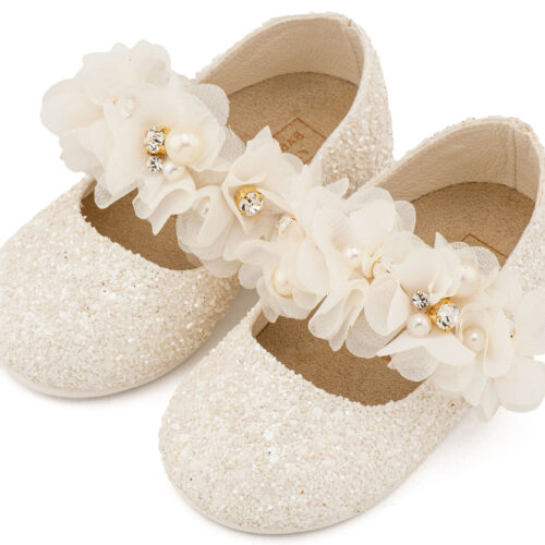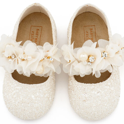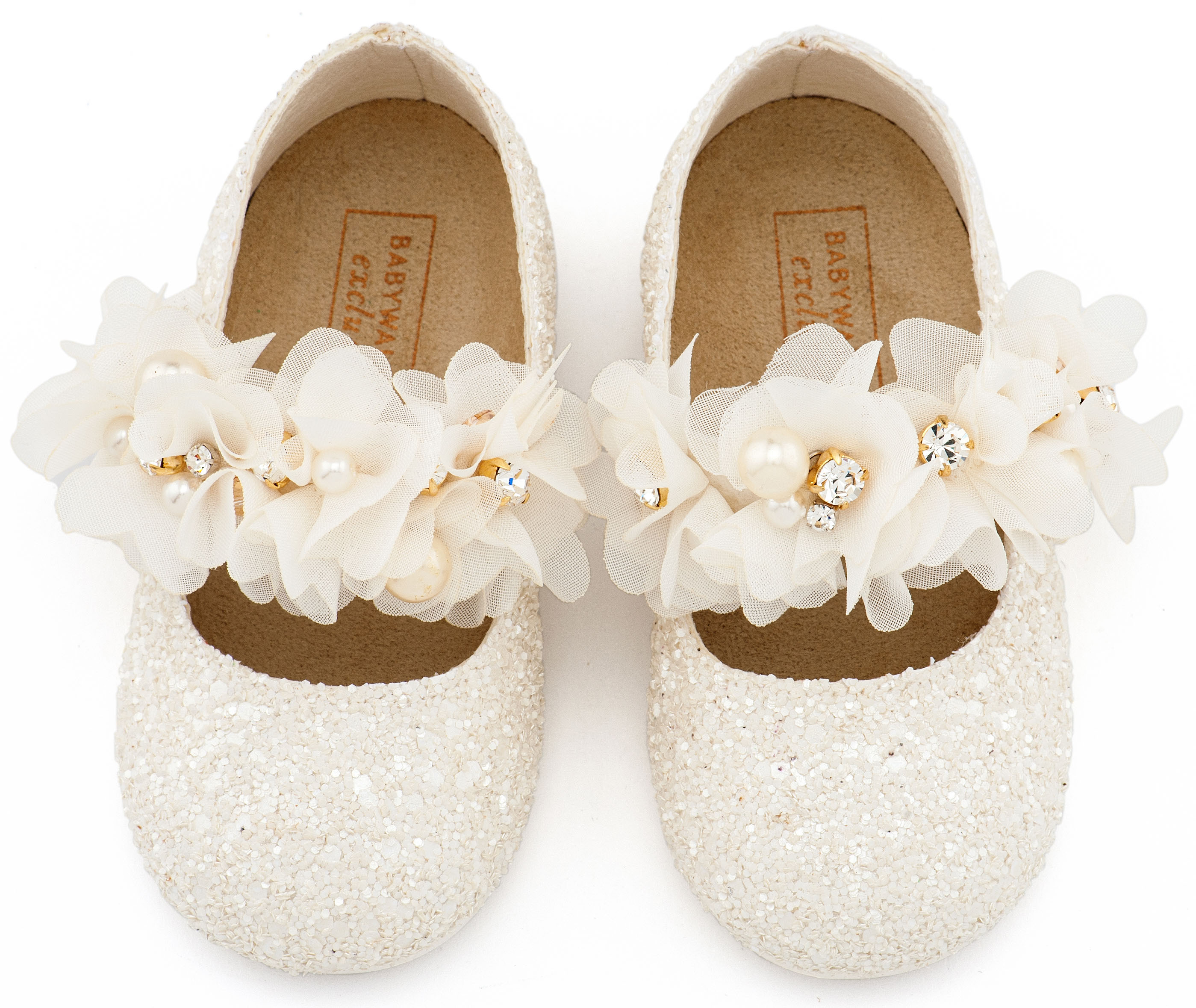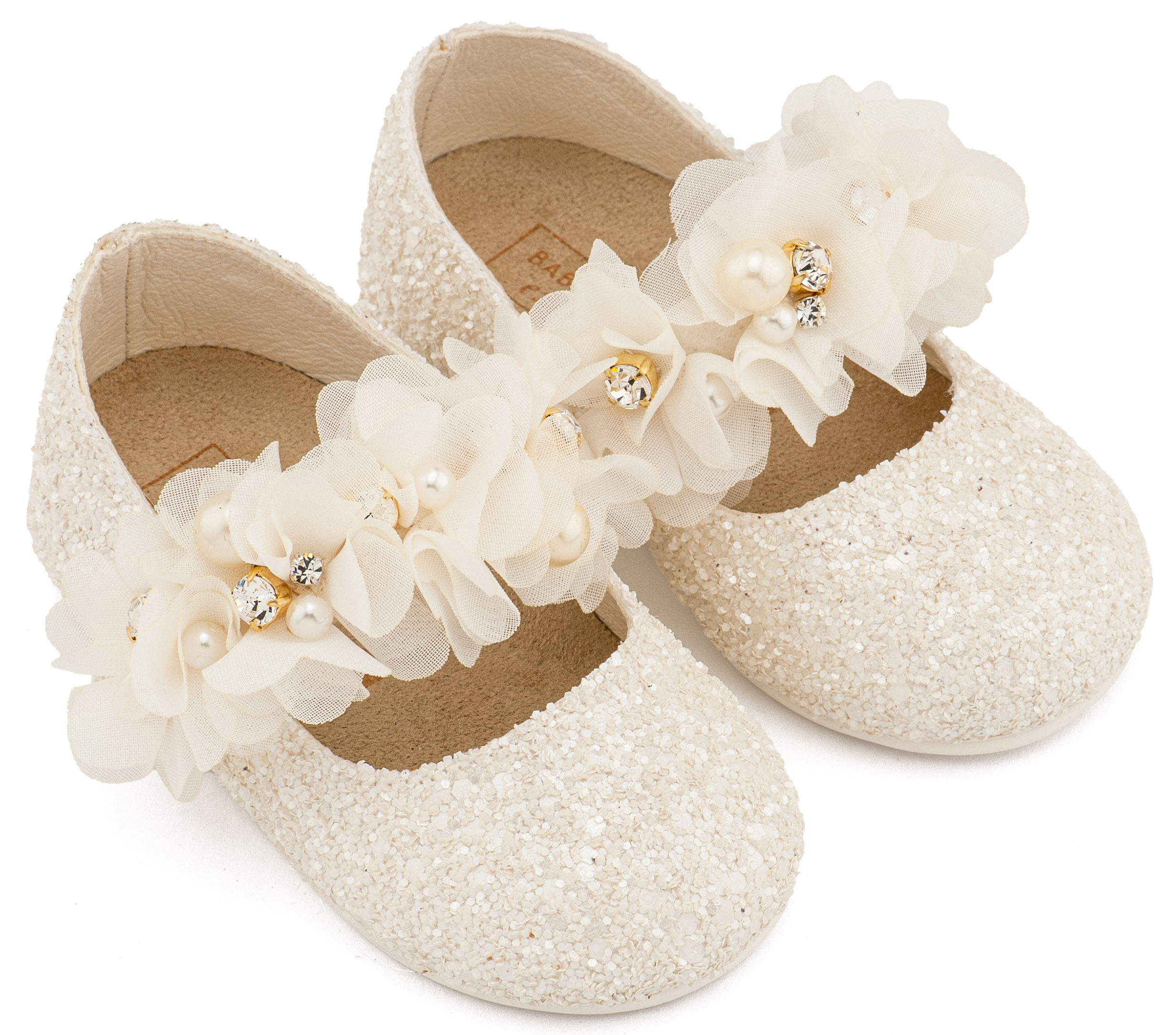 Βαπτιστικά Παπούτσια Babywalker Υφασμάτινο Glitter Γοβάκι Μονή Μπαρέτα Στρας με Λουλούδια Πέρλες και Κρύσταλλα Swarovski LU6118 Λευκό, Εκρού και Ροζ Χρώμα.