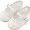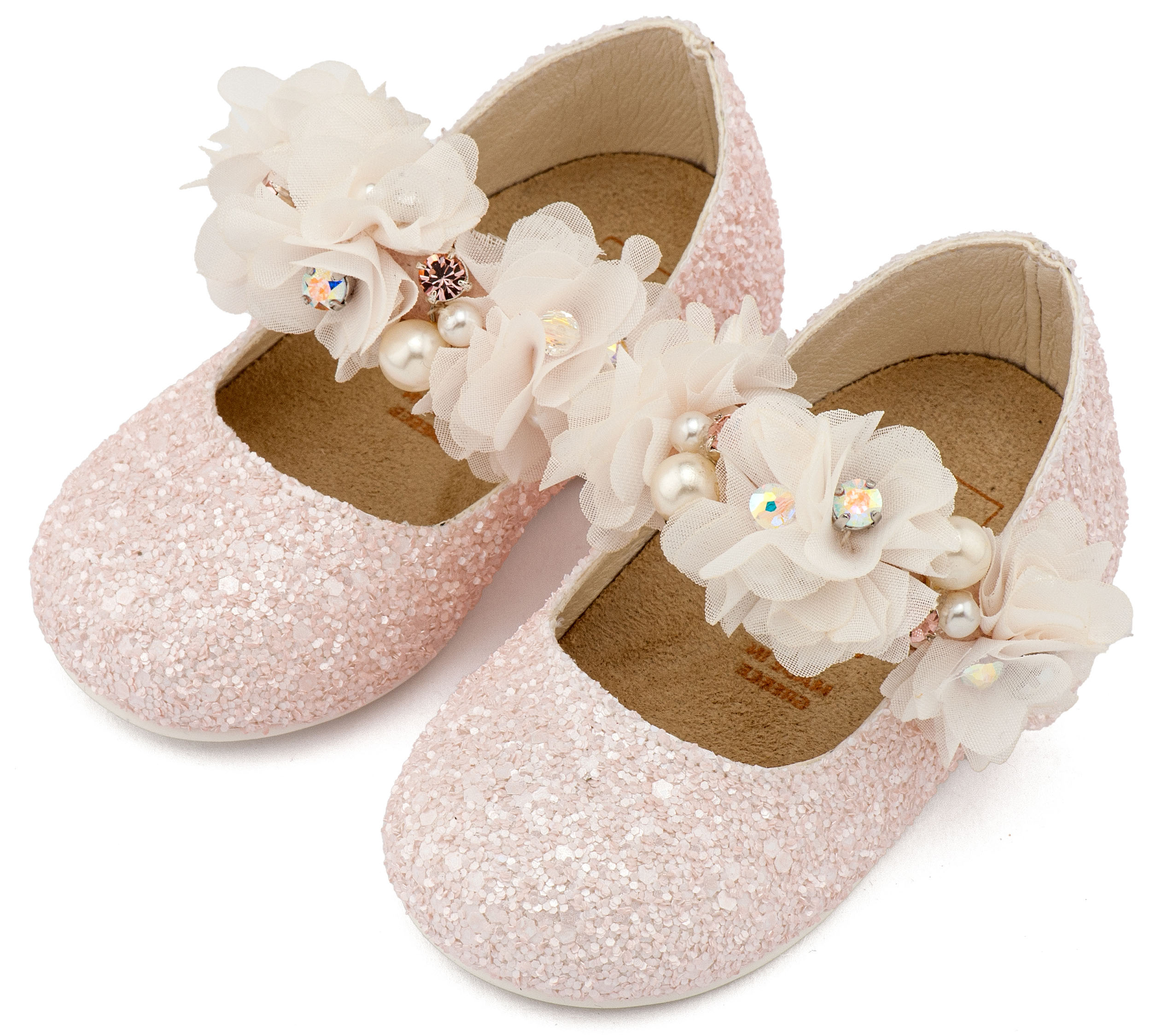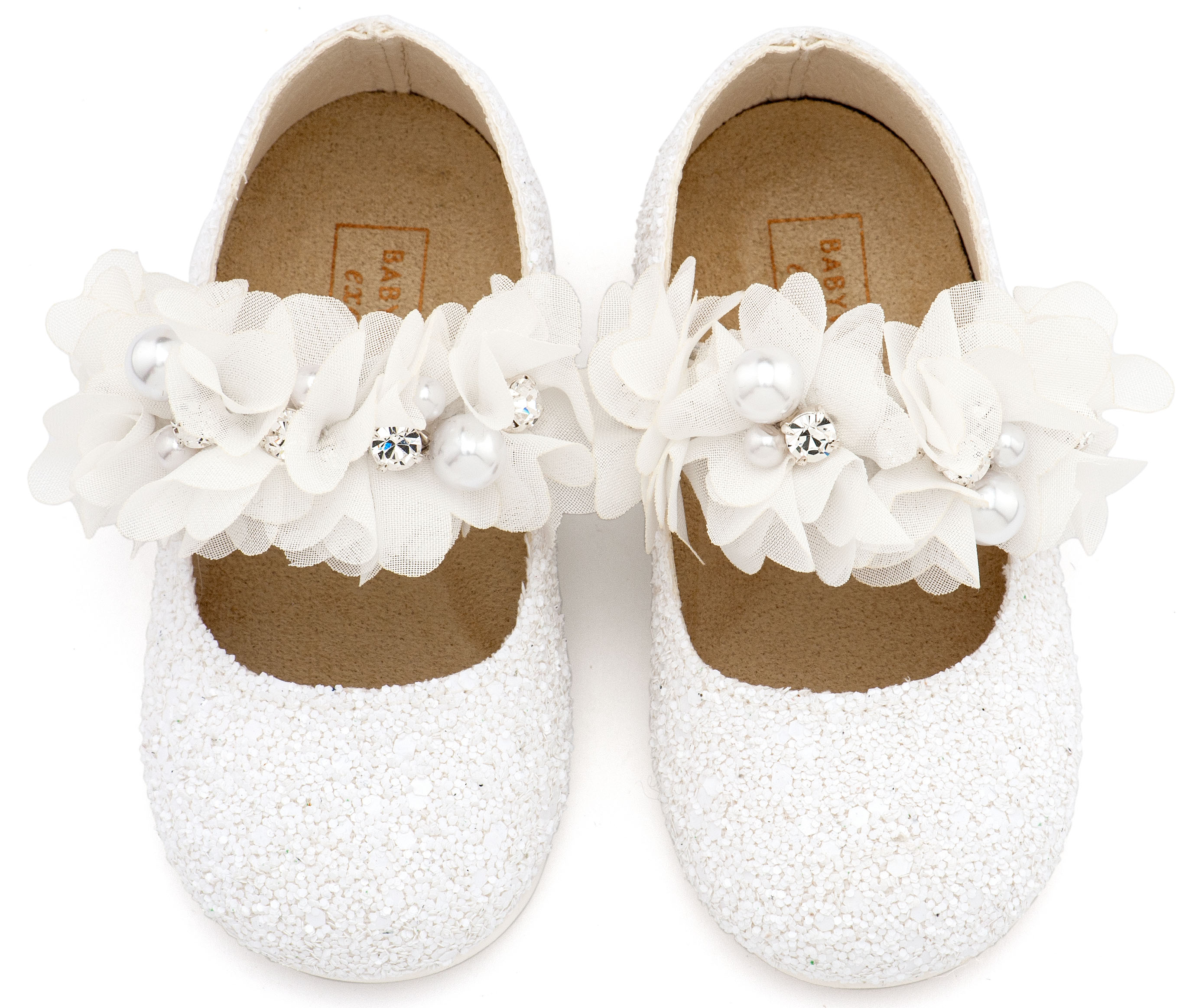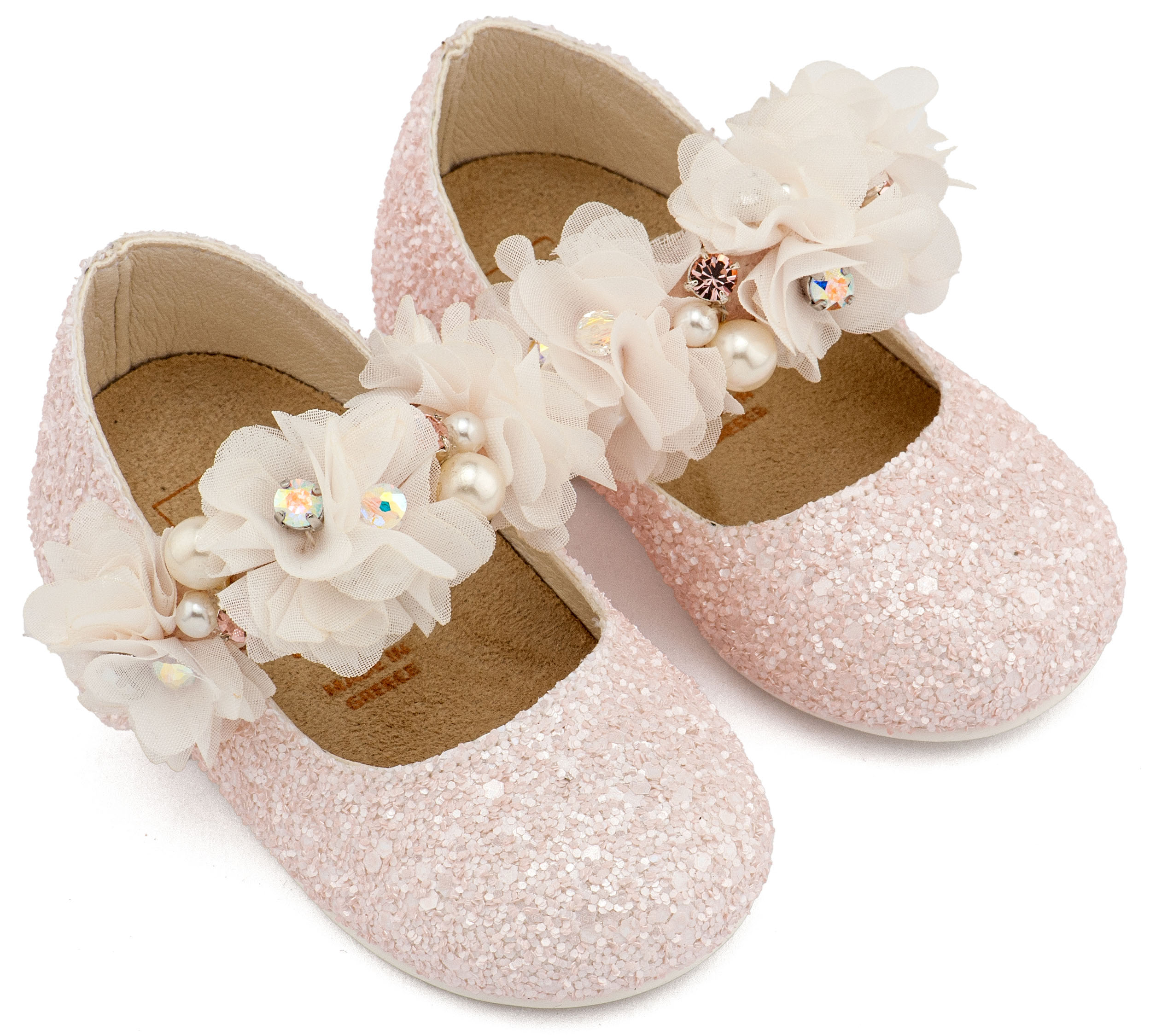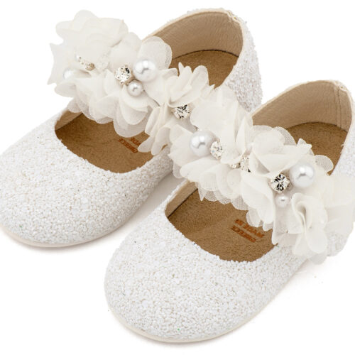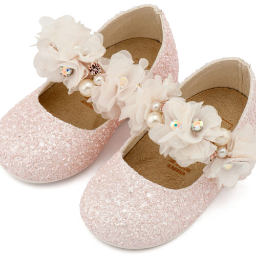 Βαπτιστικά Παπούτσια Babywalker Υφασμάτινο Glitter Γοβάκι Μονή Μπαρέτα Στρας με Λουλούδια Πέρλες και Κρύσταλλα Swarovski LU6118 Λευκό, Εκρού και Ροζ Χρώμα.