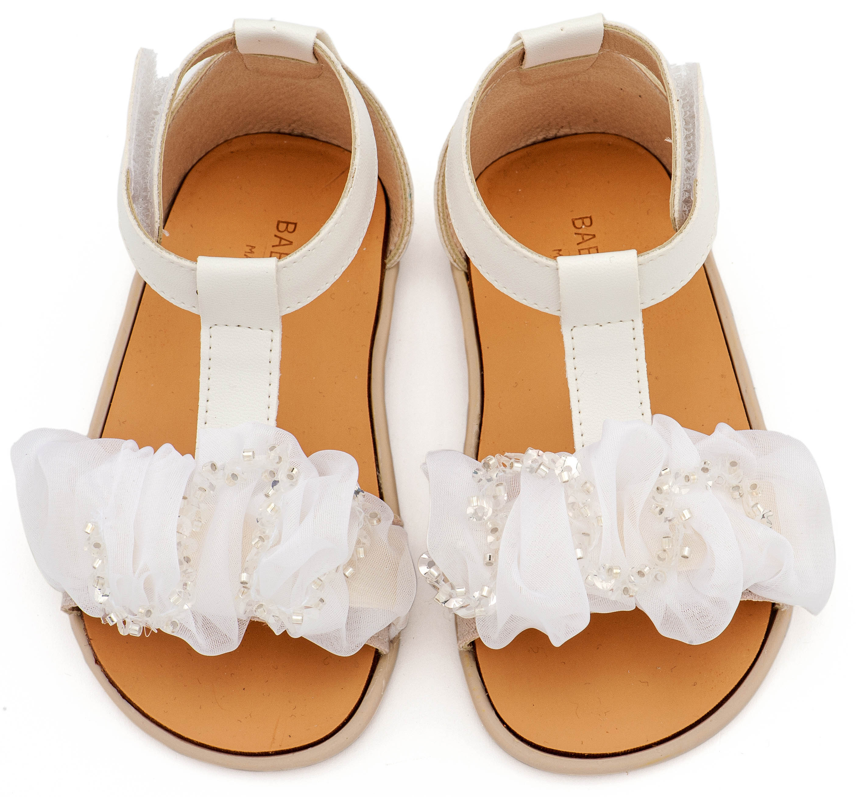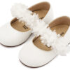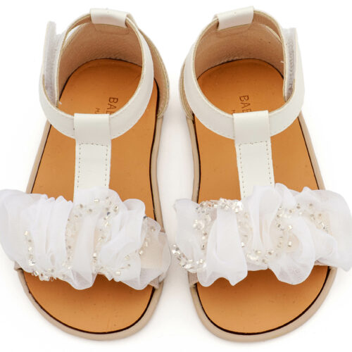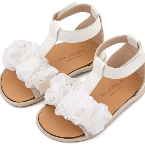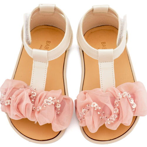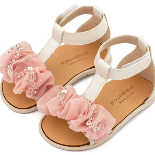 Βαπτιστικά Παπούτσια Babywalker BS3601 Δερμάτινο Πέδιλο Διακοσμημένο με Χειροποίητο Διακοσμητικό Οργάντζας και Παγιέττες σε Λευκό και Εκρού Ροζ Χρώμα.
